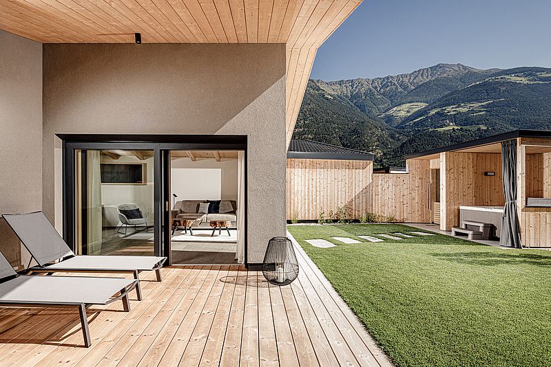 Solo il silenzio. E voi. Una vacanza benessere in Val Venosta ricca di puro wellness: potete rilassarvi completamente nelle nostre lodge e nelle suite. Mentre nelle lodge vi aspetta una Whirpool in giardino, nelle suite troverete un lettino a infrarossi o una sauna.